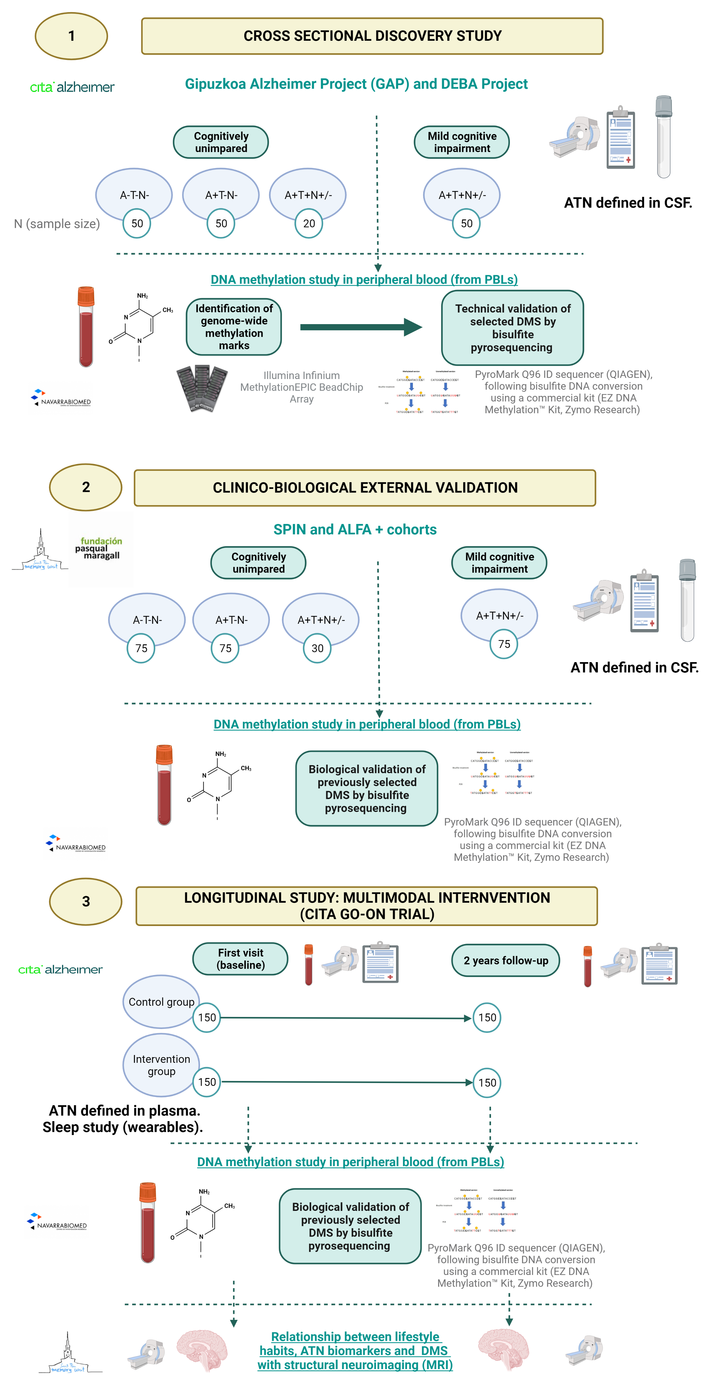 1. Identificación de marcas epigenéticas relacionadas con biomarcadores clave (amiloide, tau, neurodegeneración y factores vasculares) en personas en etapas iniciales de la EA.